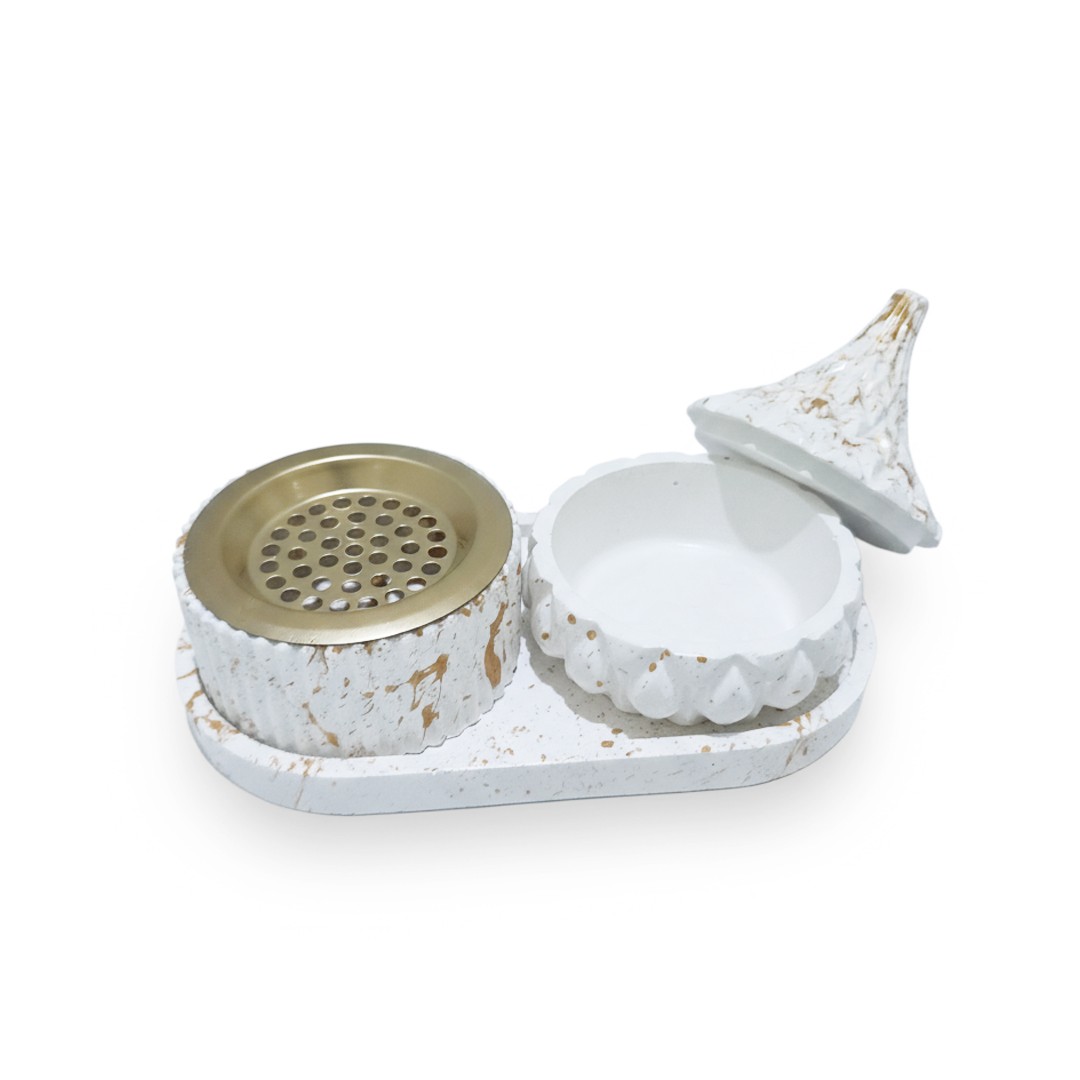 Le brûleur est doté d’un couvercle métallique perforé permettant une diffusion homogène du parfum, tandis que la boîte assortie permet de conserver votre bakhour avec élégance et praticité.