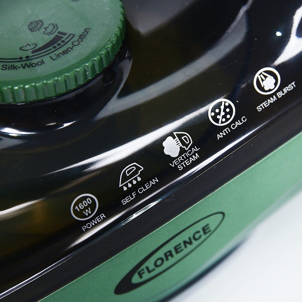 Fer à Repasser 1600W Bleu - Florence HK424 - Puissance maximale : 1600W - Tension : 220–240V ~ 50/60Hz - Capacité du réservoir d’eau : 210 ml - Débit de vapeur : 20 g/min - Plaque de base en céramique antiadhésive - Vapeur verticale pour défroissage rapide des vêtements suspendus - Technologie Glide 3D pour une glisse fluide et sans effort -Jet de vapeur, fer à sec, fer à vapeur, spray vapeur et vapeur continue - Garantie : 12 Mois