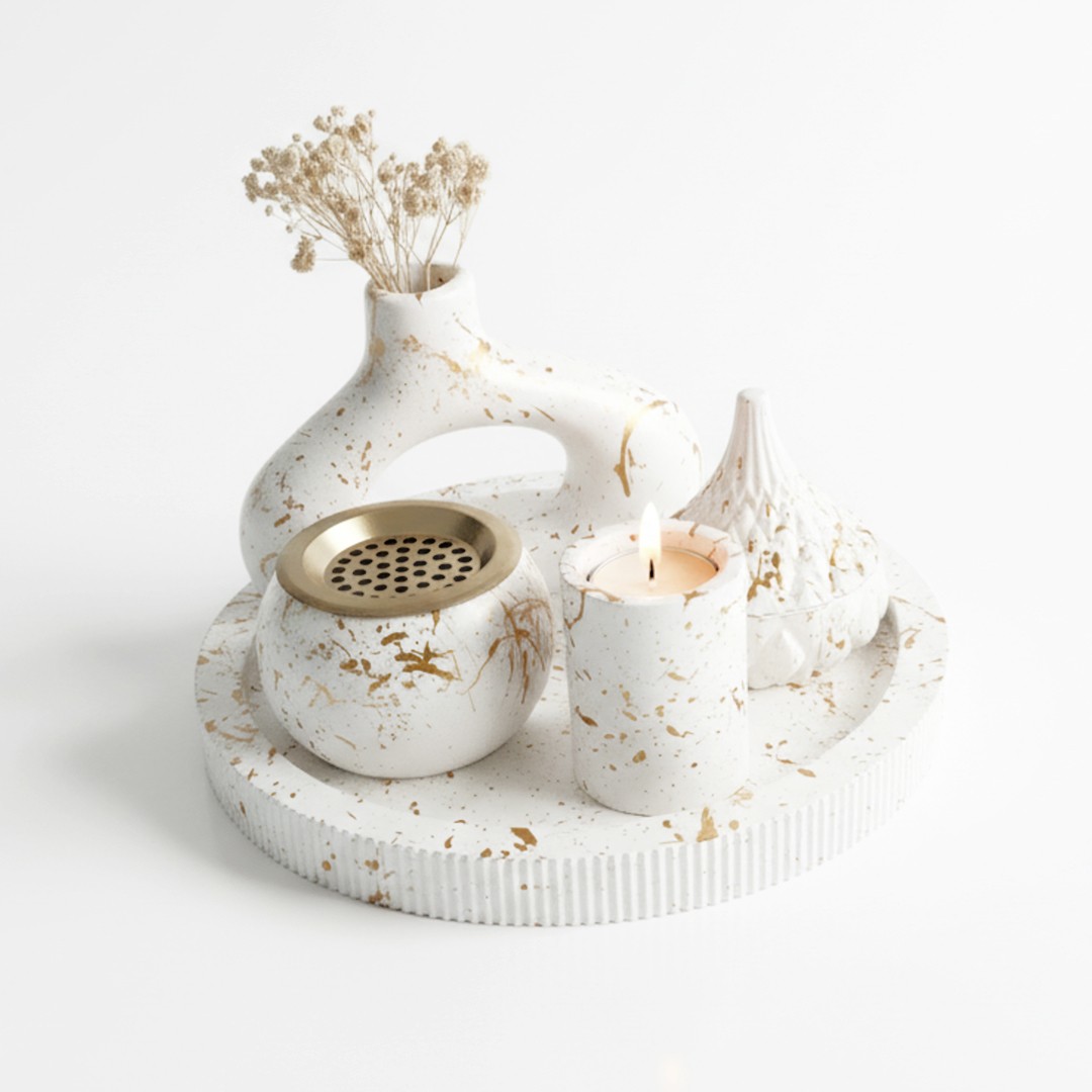 Apportez une touche de raffinement et de sérénité à votre intérieur avec ce set décoratif en  plâtre effet marbré blanc et doré. Composé d’un encensoir, d’un bougeoir, d’un vase décoratif et de leurs accessoires assortis, l’ensemble repose sur un plateau harmonieux au design minimaliste.