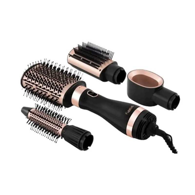 Marque : Lexical - Modèle : LAS-5204 - Fonctions : Séchage, lissage, brushing, bouclage - Puissance : 1000W - Matériau : Plastique haute qualité - Poignée pliable : Non - Longueur du câble : 1,8 m - Câble rotatif : Oui - Anneau de suspension : Oui - Accessoires inclus : - Brosse ronde volumisante - Brosse fine - Brosse lissante - Concentrateur - Couleur : Noir et rose gold - Garantie :12 Mois