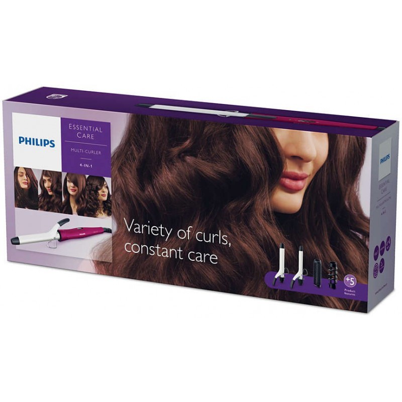 Fer À Boucler Multi-Styler 4EN1 PHILIPS - Diamètres embout : 16-22mm - Température max : 190 °C -  Temps de chauffage : 180 sec - Longueur de câble : 1,8 m - Accessoires : Pince à friser, Accessoire spirale, Brosse ronde Avec cordon pivotant - Avec Sac de rangement - Couleur : Rose - Garantie : 1 an