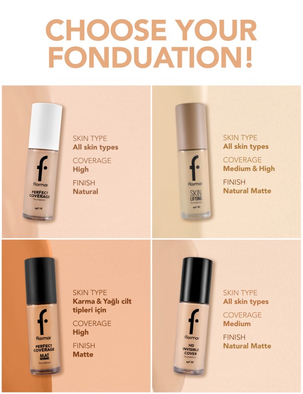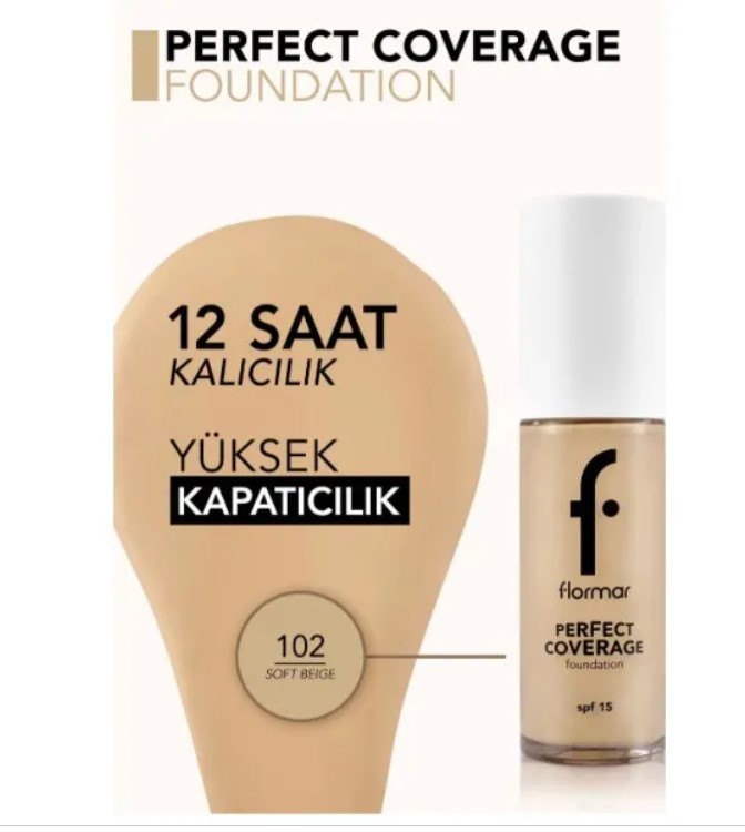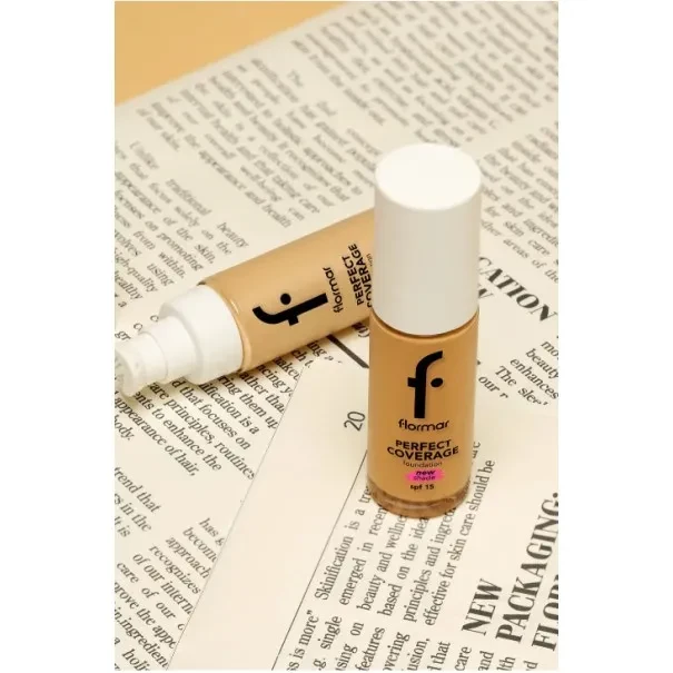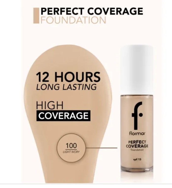 Le Fond de teint Flormar Perfect Coverage assure une couvrance longue durée (12h) et un teint lisse et uniforme.