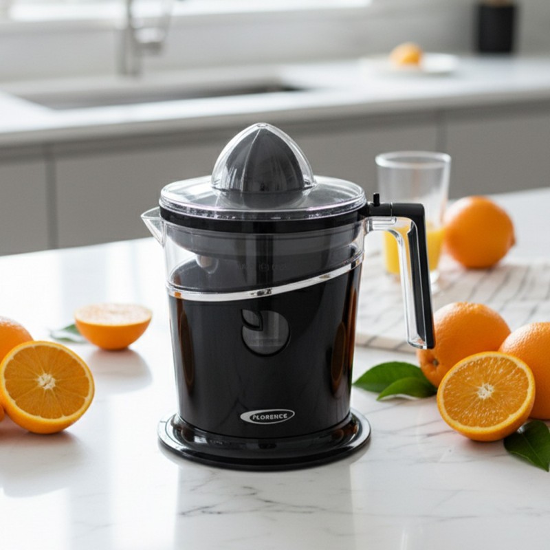 Presse-Agrume Électrique 100W 0.8 L – Florence HK444-4 JUS 0.8L - Tension : 220–240V ~ 50/60Hz - Puissance : 100W - Capacité : 0.8L - Moteur : 4420 en cuivre pur - Matériau : ABS + AS - Anneau décoratif UV - Rotation bidirectionnelle (gauche/droite) - Pièces détachables pour un nettoyage facile - Disponible en deux couleurs : Blanc / Noir - Garantie : 12 mois