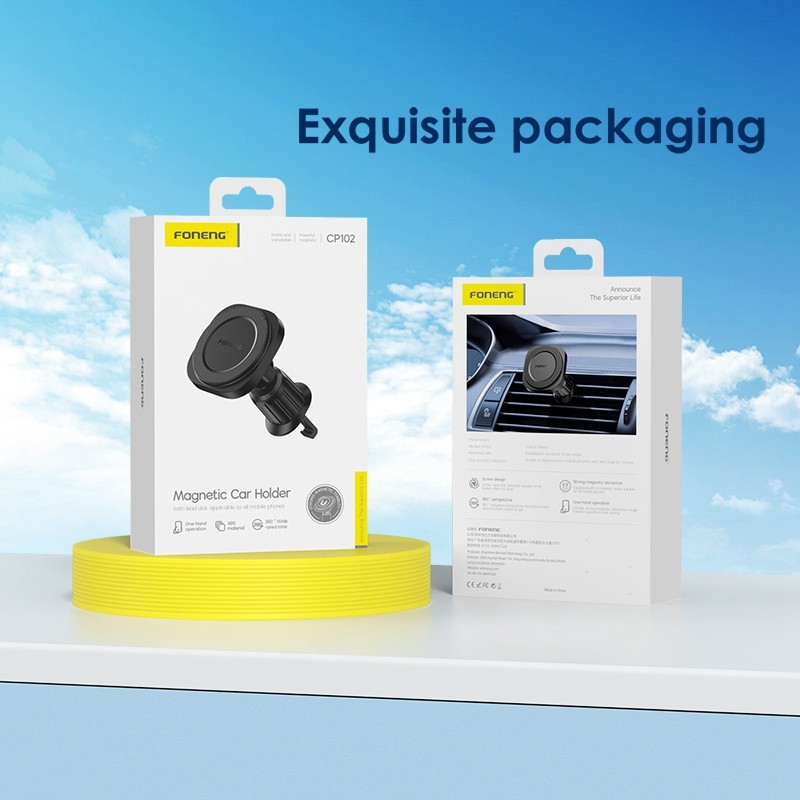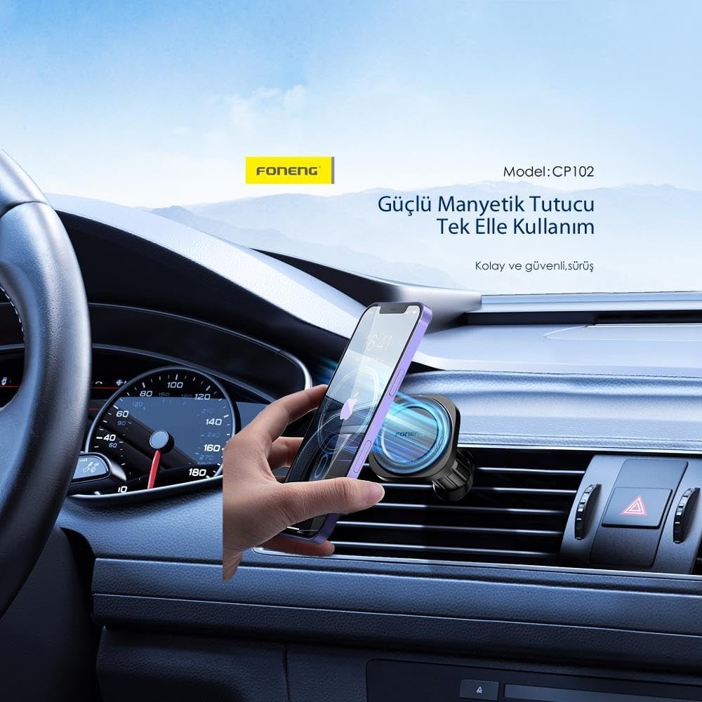 Le support téléphone voiture FONENG CP102 est conçu pour une fixation facile dans l’habitacle de la voiture, notamment sur une grille d’aération. Il utilise un système magnétique pour fixer le téléphone, tout en conservant un profil compact et discret.