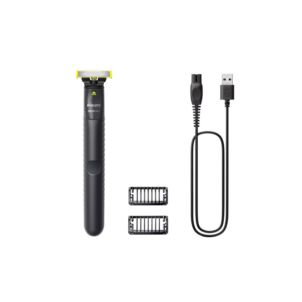 Tondeuse Philips OneBlade Hybride QP1424/10 Visage et Corps - Système de rasage - Système de coupe - Capuchon de protection - Peigne : 2 peignes à chaume clipsables (1, 3 mm) -Type de batterie : Rechargeable Ni-MH - Tension automatique : 5 V - Mise en charge : 8 heures de charge complète - Durée de charge 30 minutes - Consommation maximale : 0.5 W - Adaptateur USB-A - Couleur : Gris anthracite - Garantie : 1 an